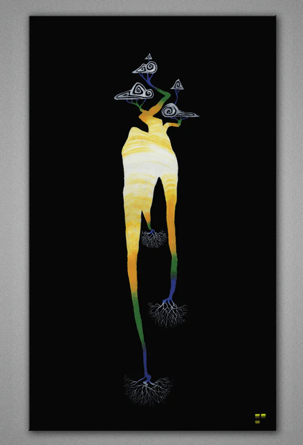 地上に見えている世界と地下の世界が樹木をモチーフに描かれた作品。世の中に見えているものの裏側には、見えていない真実があるといったメッセージを投げかけているような一枚。思想家のEricらしい一枚。原画はキャンバスにオイルペイントで施されたものをプリント、サイズもチョイスできる。送付には硬いチューブに巻かれた状態でシッピングされるので、破損や折れも心配なし。サイズは、横約25cm×縦20cm~横120㎝×縦90㎝まで選べる。