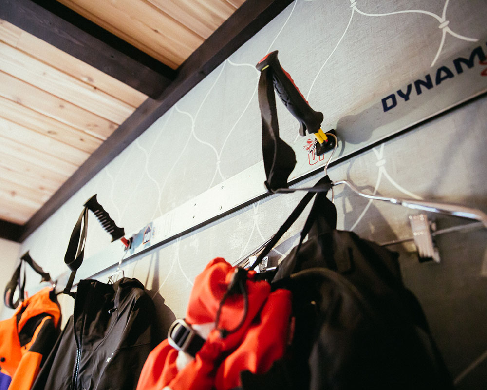スキー板1本を使用した壁付ハンガーラック。ポールのグリップ部を再利用し、ほぼすべてのパーツをUPCYCLEパーツで制作。これも妙案アイテムだ。