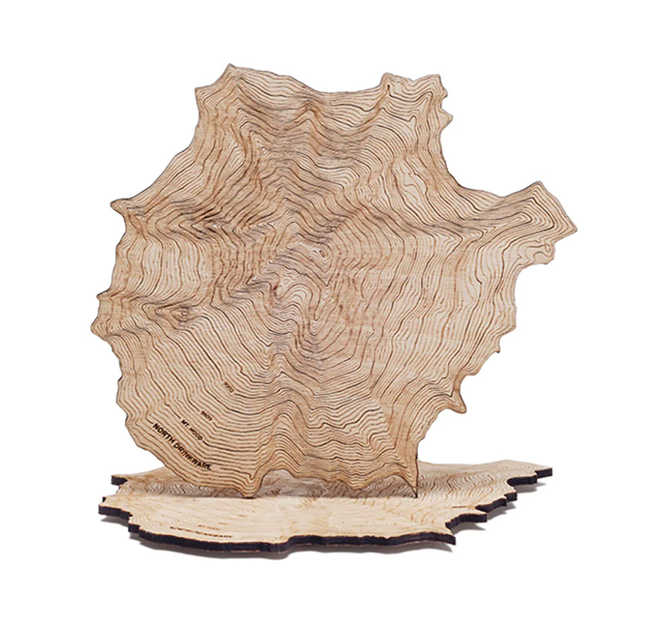 地形図をレーザーカッティングで刻み、裏面にコルクを配した、バーチプライ素材のコースター。グラスを手にしたらコースターまできっと欲しくなるに違いない。各コレクションの山の地形図を地図から完全に再現、オブジェとしても魅力的。