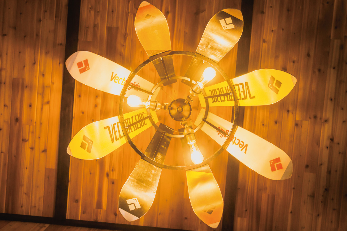 スキー板でメイン照明になるシャンデリア。なんとも奇抜で新鮮! 外からはトップシート、灯が灯るとソール部分が鮮やかに浮かび上がり、2面で楽しめる。