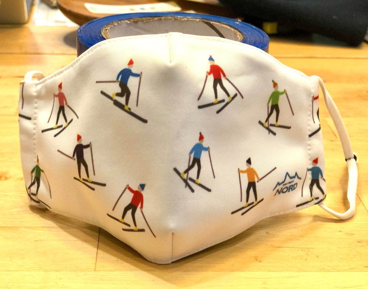 スキーヤー柄のオリジナルマスク。表はストレッチ素材で、裏はフィルターを入れるポケット付き。ファクトリーで作られている。