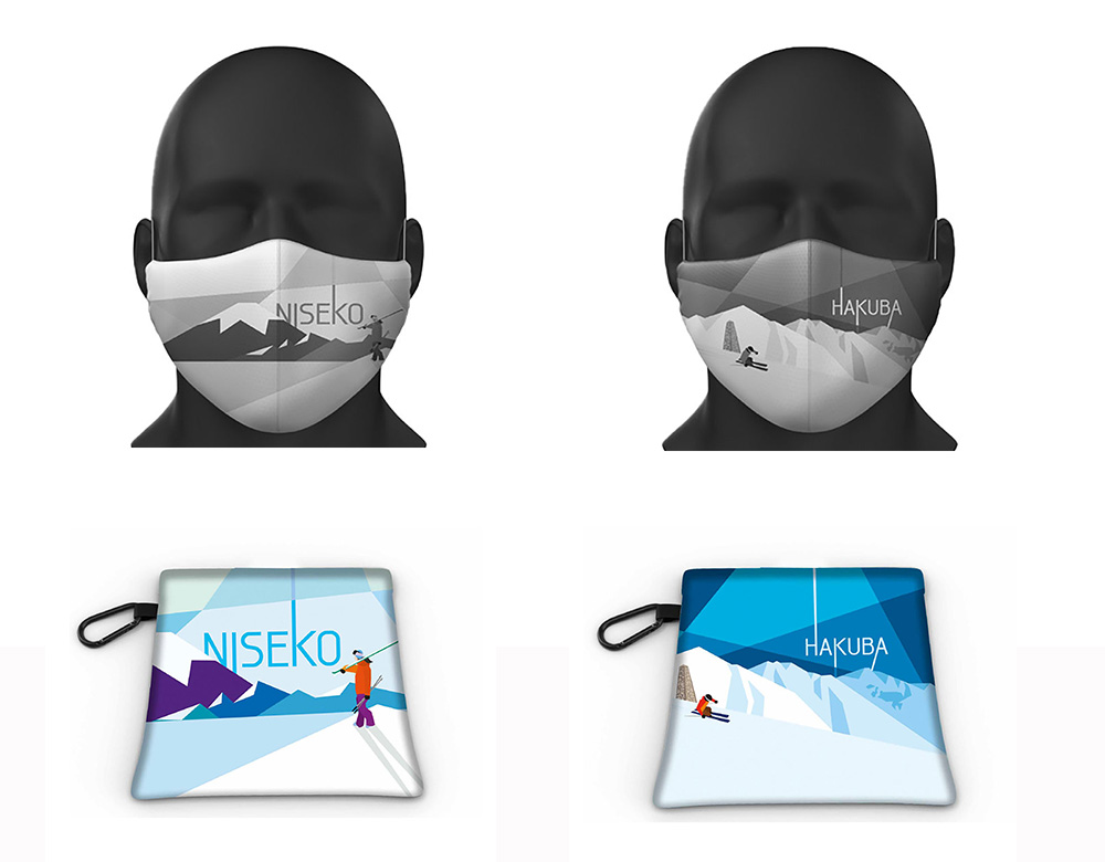 gogglesocの独特の素材感を活かしたマスク。もちろん洗って何度でも使える。リゾートとのコラボレーションのマスクは、ご覧のようにクールなモノトーングラフィックに、カラフルな専用ポーチがついている。ニセコ・白馬の他、野沢もあり。