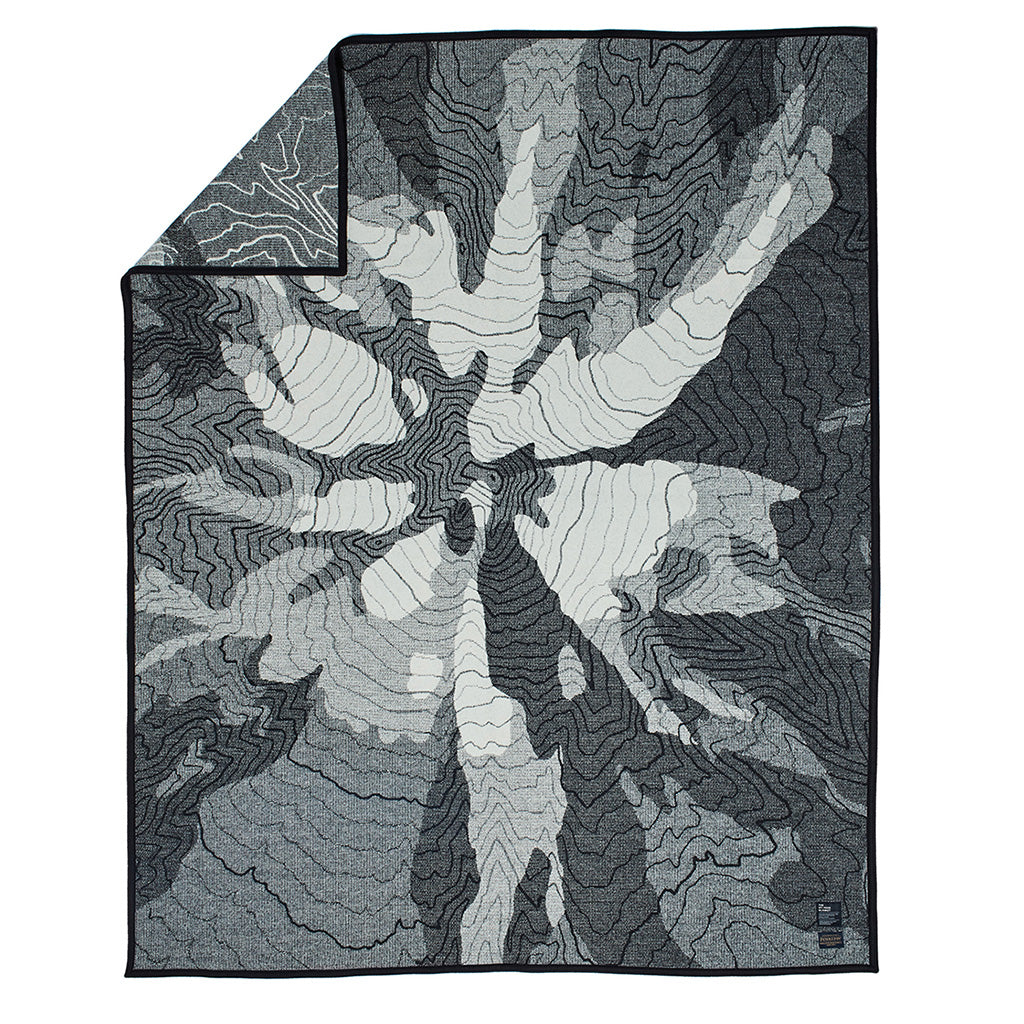 アメリカ地質調査所によるMt.Hoodの地質図をモチーフにしたブランケット。山の地形図とは思えないお洒落なグラフィックで、ゴージャスな仕上がりだ。オレゴン州ポートランドを拠点とするペンドルトン・ウール・ミルズ社がNorth Drinkwareのために別注で製作したダブルネーム商品。厚手のバージンウールを使用、野外で使うのにも、屋内でラグがわりにするのもよし。完全ハンドメイド製品のため生産数・輸入数に限りがあり、各シーズンごとの限定数量販売となる。