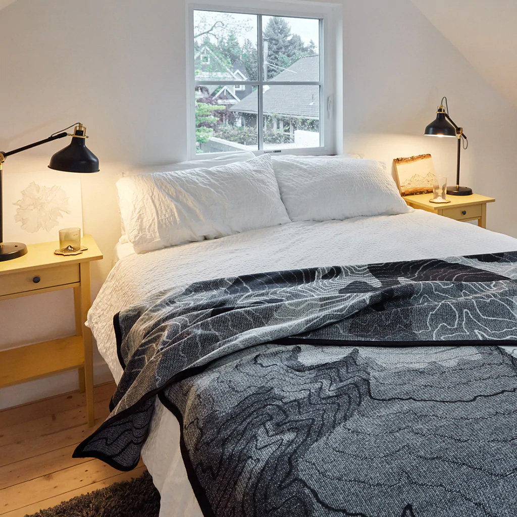 2015年にオレゴン・ポートランドで産声を上げたハンドメイドのクラフトブランド。世界の名峰をモチーフにグラスの底の部分に3Dで山を再現、ドリンクを注ぐことで、グラスの底に山の情景が浮かび上がってくるという不思議なグラスを展開しているNorth Drinkware。各コレクションの山の地形図を地図から再現してブランケットにもしてしまった。