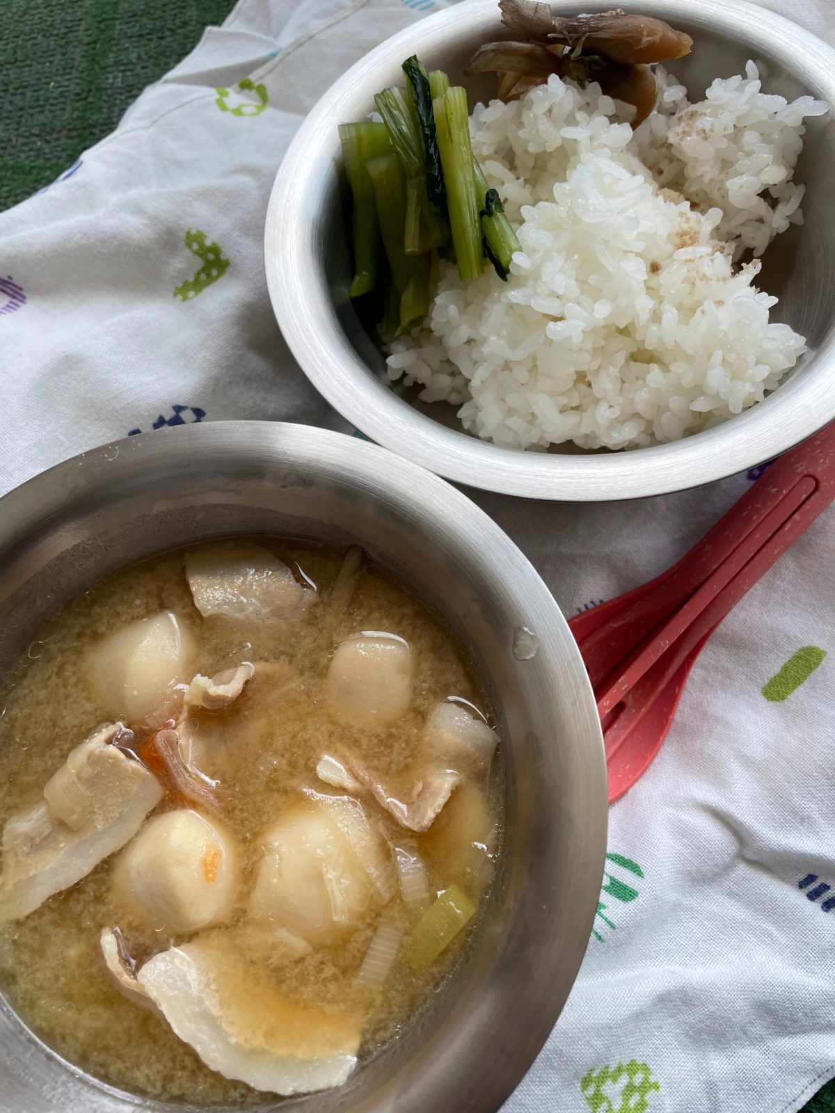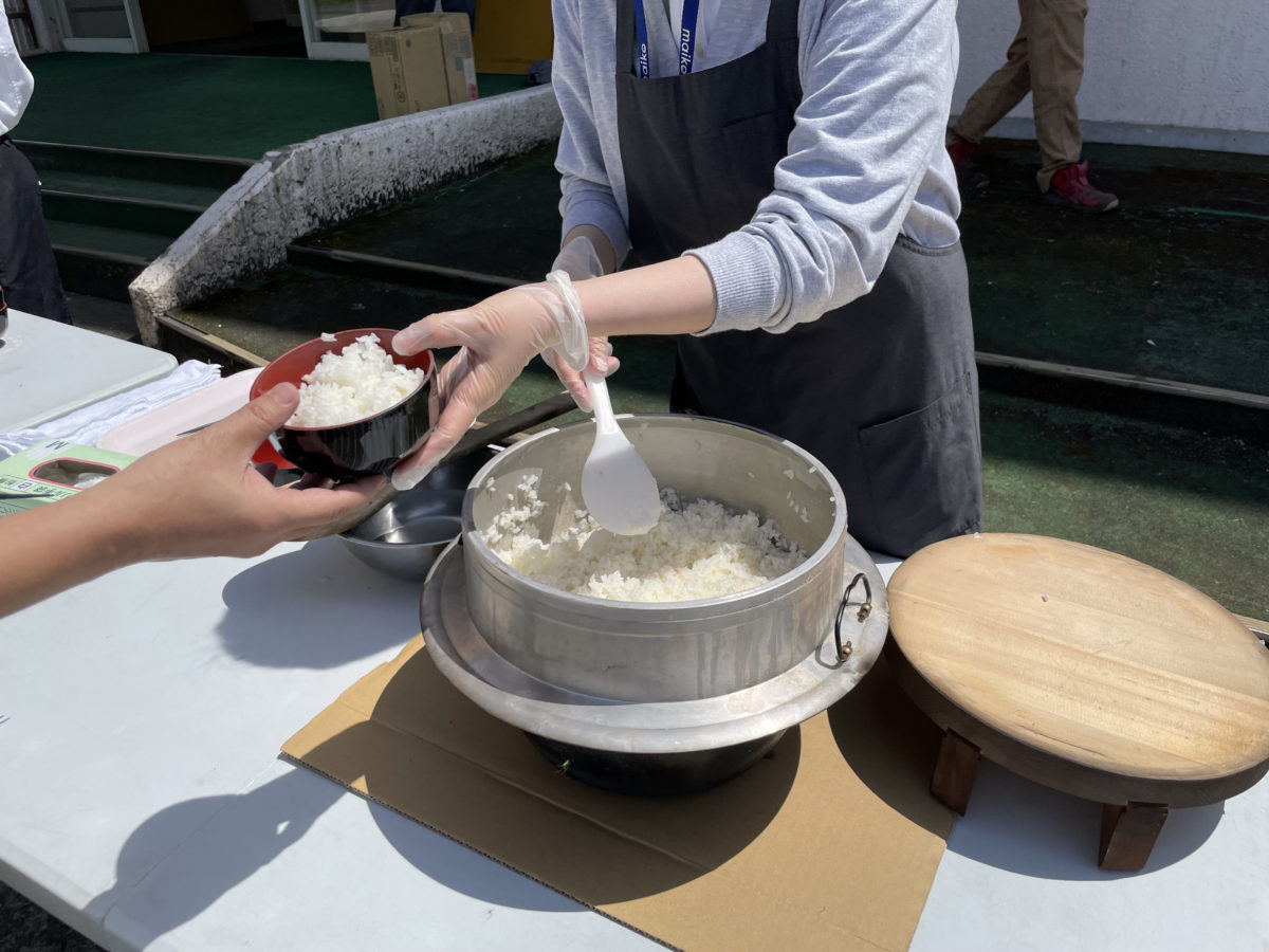 「お疲れ様でした~!」と明るく出迎えてくれた舞子リゾートのスタッフの方々。そこには炊きたての南魚沼産コシヒカリと、疲れた身体に染みわたる温かい豚汁がスタンバイしていた。