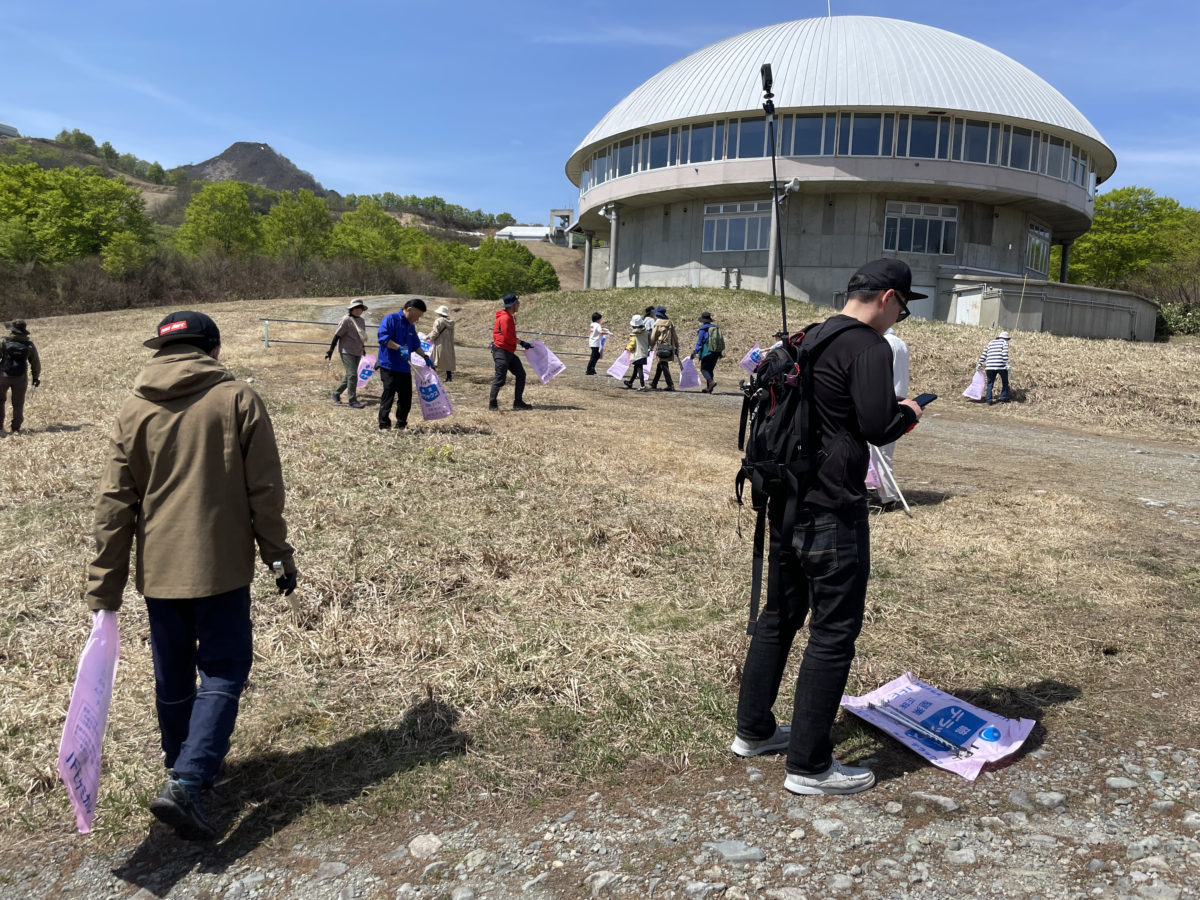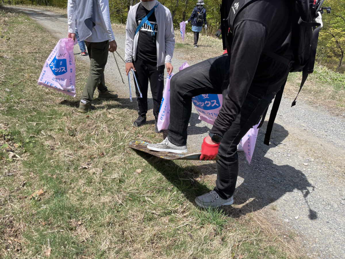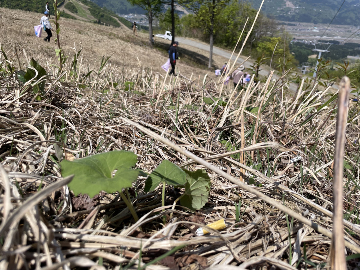 10時、各自トングとゴミ袋を持って、マウンテンクリーンがスタート。コースに沿って下っていき、足元に落ちているゴミを見つけていく。雪に覆われていないゲレンデは、冬の雰囲気とはまったく違った風景で新鮮だ。